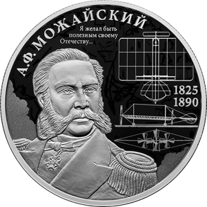 Монета «Контр-адмирал А.Ф. Можайский, к 200-летию со дня рождения» серии «Выдающиеся личности России» номиналом 2 рубля выпущена тиражом 3000 штук. Она имеет форму круга диаметром 33 мм. Масса драгоценного металла в чистоте — 15,55 г, проба сплава — 925.