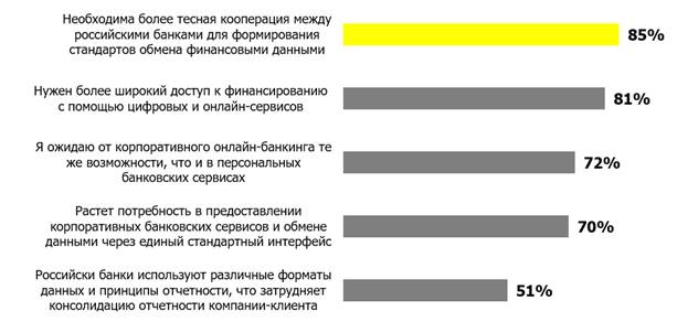 Большинство компаний крупного и среднего бизнеса ждут от банков более тесной кооперации в формировании общих стандартов обмена финансовой информацией. Таковы результаты исследования, проведенного Райффайзенбанком и аналитическим агентством B2B International, в котором приняли участие более 200 российских компаний. Крупные и средние российские компании пользуются широким спектром банковских продуктов и сервисов и чаще всего работают с 3-4 различными финансовыми организациями. Этим объясняется желание 85% участников исследования улучшить сотрудничество между обслуживающими банками: привести к единым стандартам обмен финансовыми данными, отчетность, документооборот. Доля российских компаний крупного и среднего бизнеса, согласных с утверждениями о корпоративном финансировании
