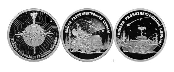 - Третья монета: рельефное изображение комплекса радиоэлектронной борьбы «Инфауна» на фоне выполненных в технике лазерного матирования изображений ночного неба и леса; вверху по окружности имеется рельефная надпись: «ВОЙСКА РАДИОЭЛЕКТРОННОЙ БОРЬБЫ» (каталожный № 5109-0137).