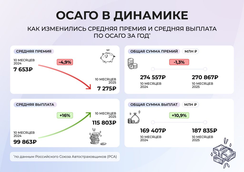 За период с января по октябрь 2025 года средняя премия по обязательной «автогражданке» составила 7 275 рублей, что на 4,9% меньше, чем за 10 месяцев 2024 года, когда этот показатель достиг отметки в 7 653 рублей.