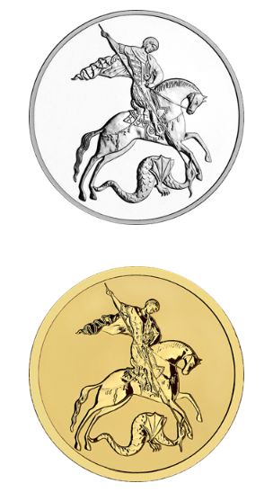 На оборотной стороне — рельефное изображение Георгия Победоносца на коне, поражающего копьем змея.