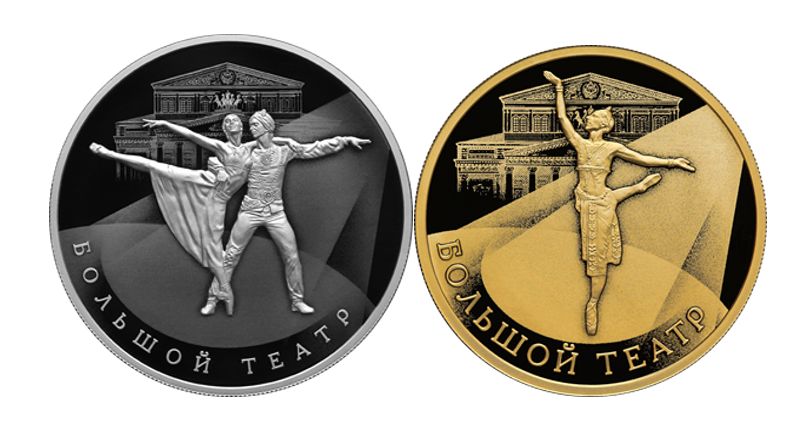 - монеты номиналом 25 рублей расположено рельефное изображение танцующей балетной пары на фоне изображений здания Большого театра и света софитов, выполненных в технике лазерного матирования; внизу по окружности – надпись: «БОЛЬШОЙ ТЕАТР».